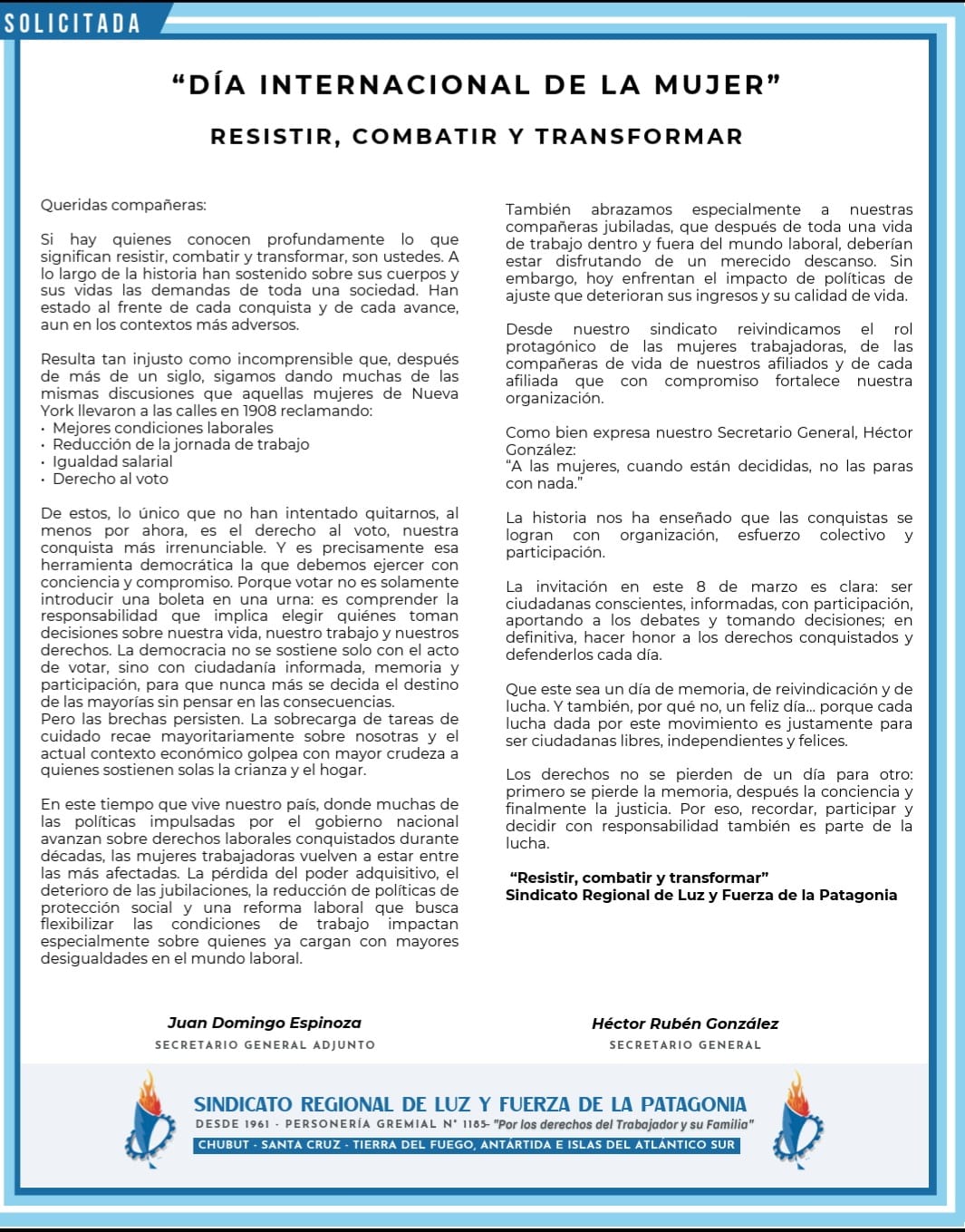 Resistir, combatir y transformar Queridas compañeras: Si hay quienes conocen profundamente lo que significan resistir, combatir y transformar, son ustedes. A lo largo de la
